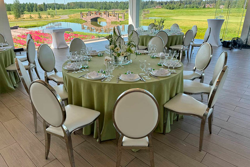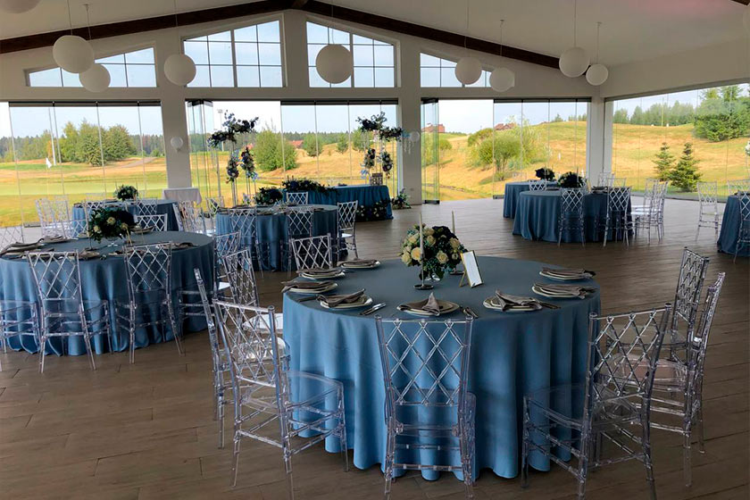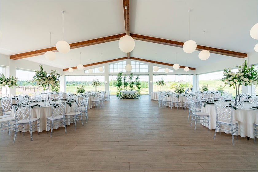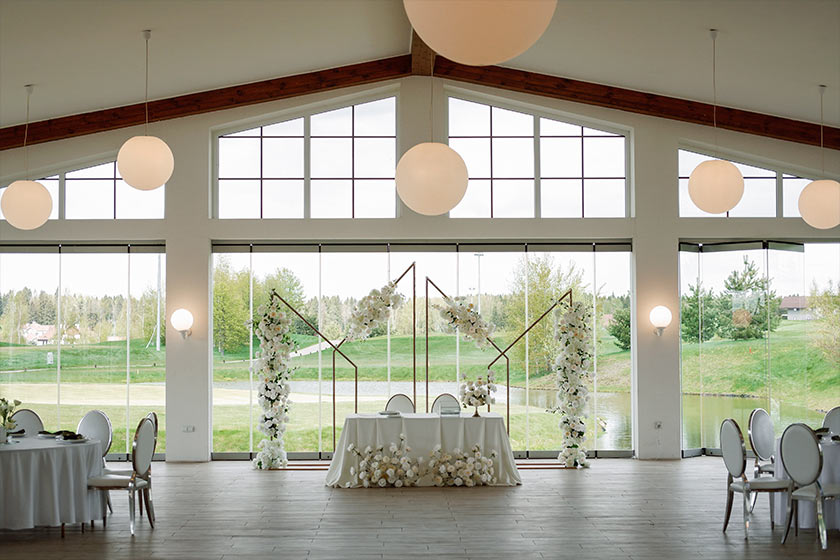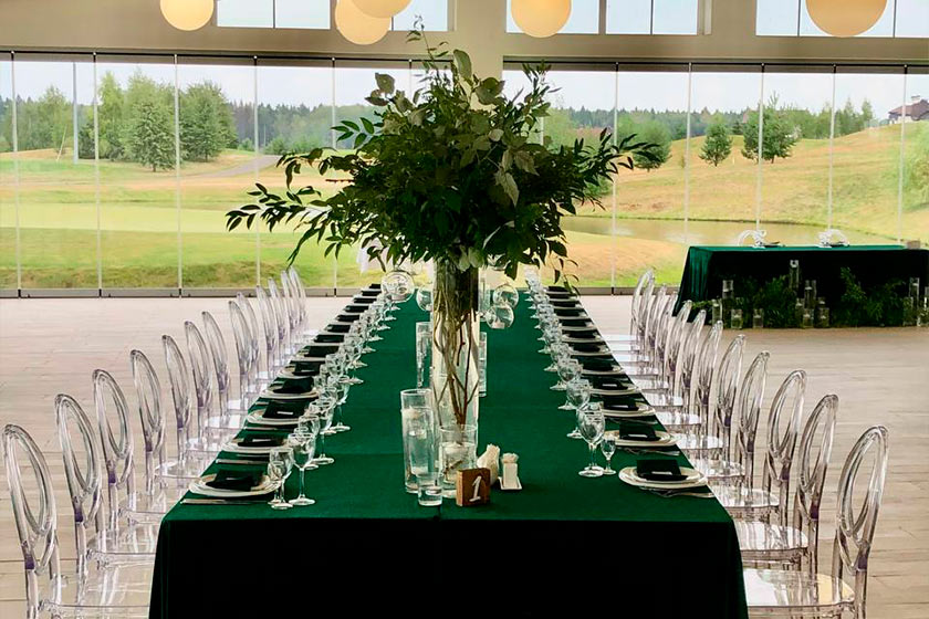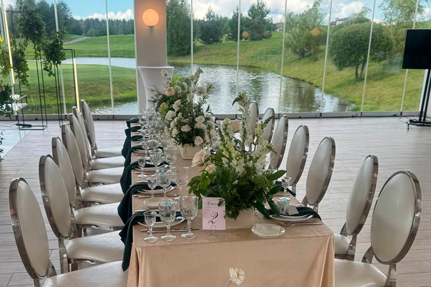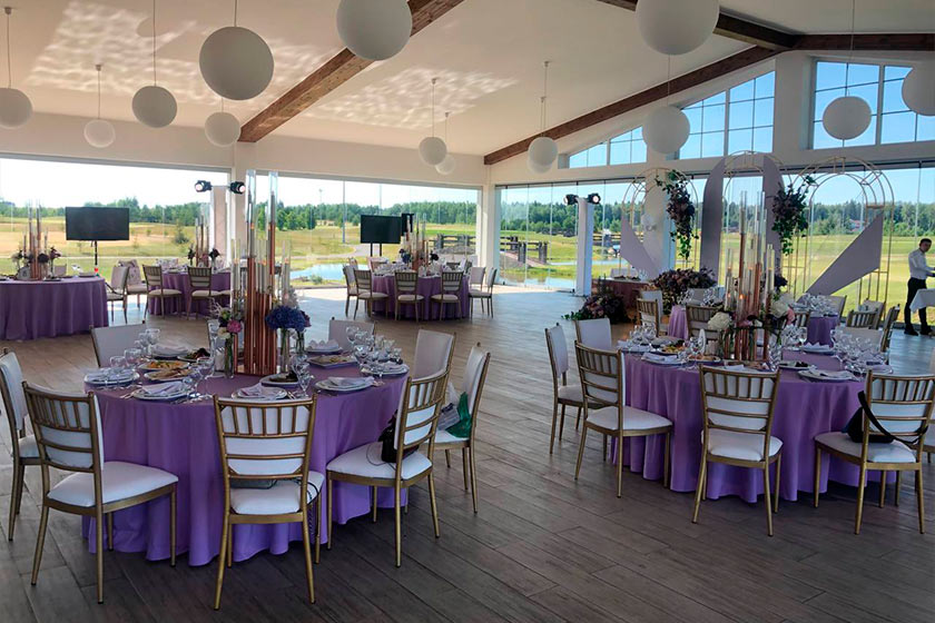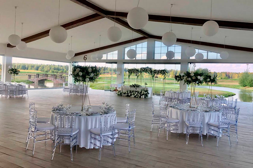 Романтическое пространство: зал площадью 420 кв.м. с высотой потолков 7 метров и панорамным остеклением, откуда открывается захватывающий вид на гольф-поле. Идеально для банкетов от 30 до 180 человек