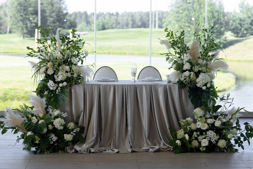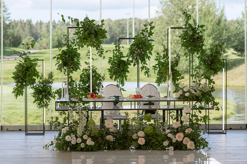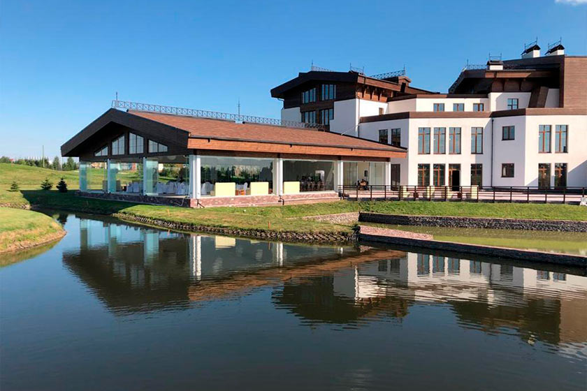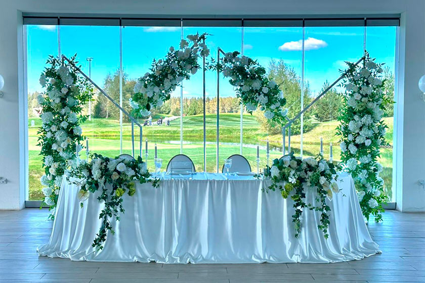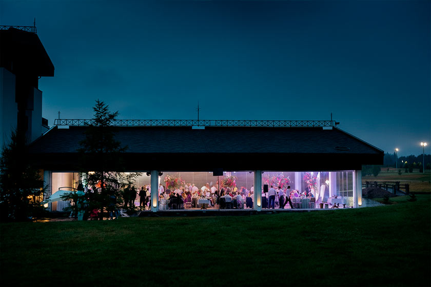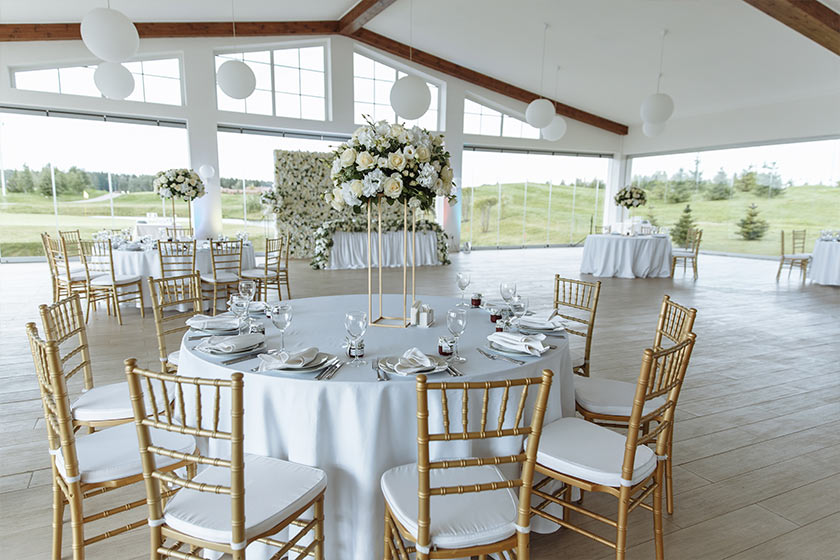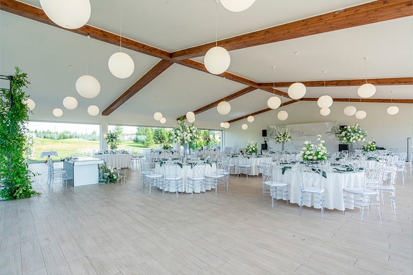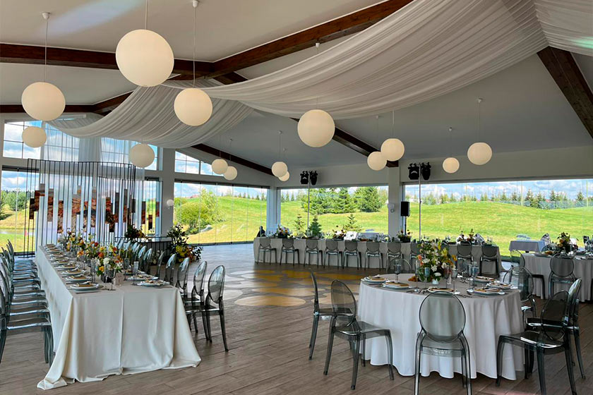 Романтическое пространство: зал площадью 420 кв.м. с высотой потолков 7 метров и панорамным остеклением, откуда открывается захватывающий вид на гольф-поле. Идеально для банкетов от 30 до 180 человек