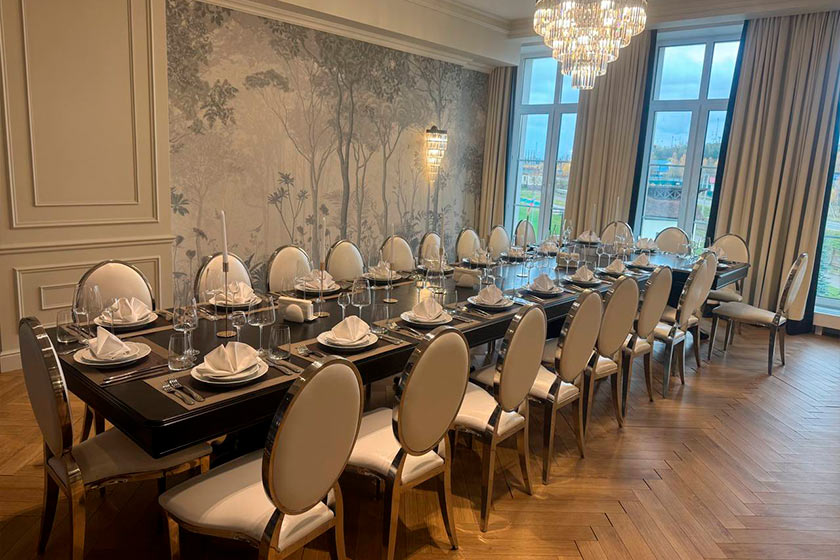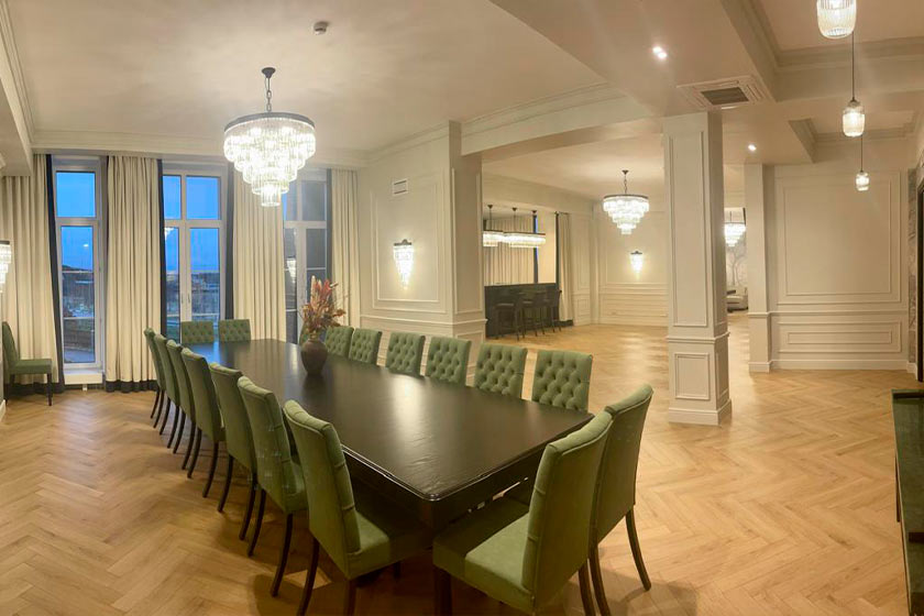Изысканность и комфорт: зал разделен на три функциональные зоны: элегантная банкетная зона, стильный контактный бар с танцполом и уютная диванная зона с профессиональным караоке